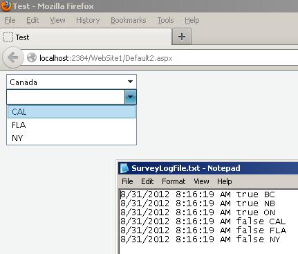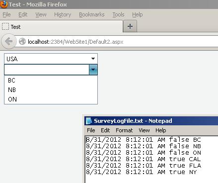 protected void Page_Load(object sender, EventArgs e) { if (!IsPostBack) { RadComboBoxItem item = null; item = new RadComboBoxItem(); item.Value = "1"; item.Text = "Canada"; RadComboBox1.Items.Add(item); item = new RadComboBoxItem(); item.Value = "2"; item.Text = "USA"; RadComboBox1.Items.Add(item); item = new RadComboBoxItem(); item.Value = "3"; item.Text = "BC"; RadComboBox2.Items.Add(item); item = new RadComboBoxItem(); item.Value = "4"; item.Text = "NB"; RadComboBox2.Items.Add(item); item = new RadComboBoxItem(); item.Value = "5"; item.Text = "ON"; RadComboBox2.Items.Add(item); item = new RadComboBoxItem(); item.Value = "6"; item.Text = "CAL"; RadComboBox2.Items.Add(item); item = new RadComboBoxItem(); item.Value = "7"; item.Text = "FLA"; RadComboBox2.Items.Add(item); item = new RadComboBoxItem(); item.Value = "8"; item.Text = "NY"; RadComboBox2.Items.Add(item); RadComboBox1.Text = ""; RadComboBox1.ClearSelection(); RadComboBox1.Visible = true; RadComboBox2.Text = ""; RadComboBox2.ClearSelection(); RadComboBox2.Visible = true; } }protected void RadComboBox1_OnSelectedIndexChanged(object sender, RadComboBoxSelectedIndexChangedEventArgs e) { FilterNext(ref RadComboBox1, ref RadComboBox2); }private void FilterNext(ref RadComboBox cbCurrent, ref RadComboBox cbNext) { if (cbCurrent.Text == "Canada") { for (int i = 0; i <= cbNext.Items.Count - 1; i++) { if (cbNext.Items[i].Text == "BC" || cbNext.Items[i].Text == "NB" || cbNext.Items[i].Text == "ON") { cbNext.Items[i].Visible = true; //WriteLog("true " + cbNext.Items[i].Text); } else { cbNext.Items[i].Visible = false; //WriteLog("false " + cbNext.Items[i].Text); } } } if (cbCurrent.Text == "USA") { for (int i = 0; i <= cbNext.Items.Count - 1; i++) { if (cbNext.Items[i].Text == "CAL" || cbNext.Items[i].Text == "FLA" || cbNext.Items[i].Text == "NY") { cbNext.Items[i].Visible = true; //WriteLog("true " + cbNext.Items[i].Text); } else { cbNext.Items[i].Visible = false; //WriteLog("false " + cbNext.Items[i].Text); } } } cbNext.DataBind(); }For those who want to test it out...please spend time on selection changing.. I usually need to spend like 2-3min to making it fail.