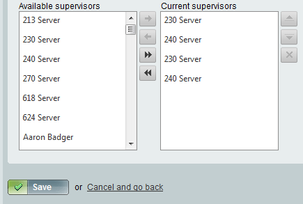 As a test to get screens for this post I edited an employee who has no supervisors. Which you can see in screenshot "001.png". Screenshot "002.png" is after adding two accounts as supervisors. The screenshot is taken after Save is clicked which means not only did it save to the database correctly, but it was loaded into the listbox correctly as well. Now in screenshot "003.png" is after clicking the Save button once more without performing any work with the listboxes. As you can see the two entries are repeated.