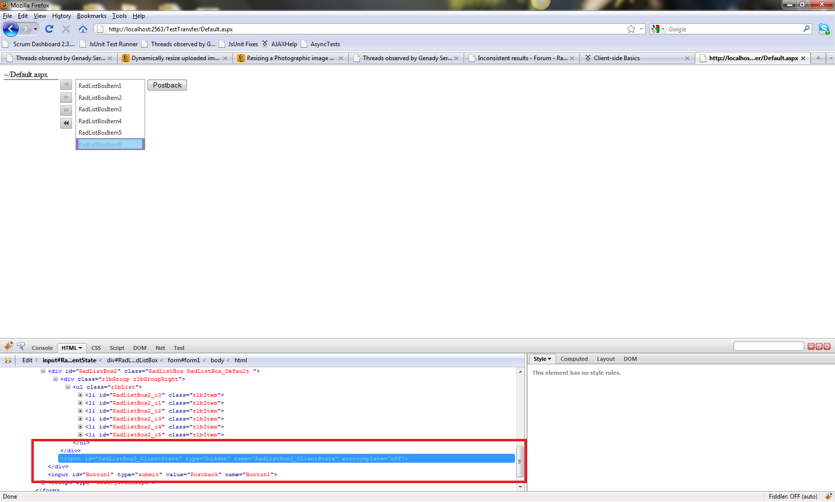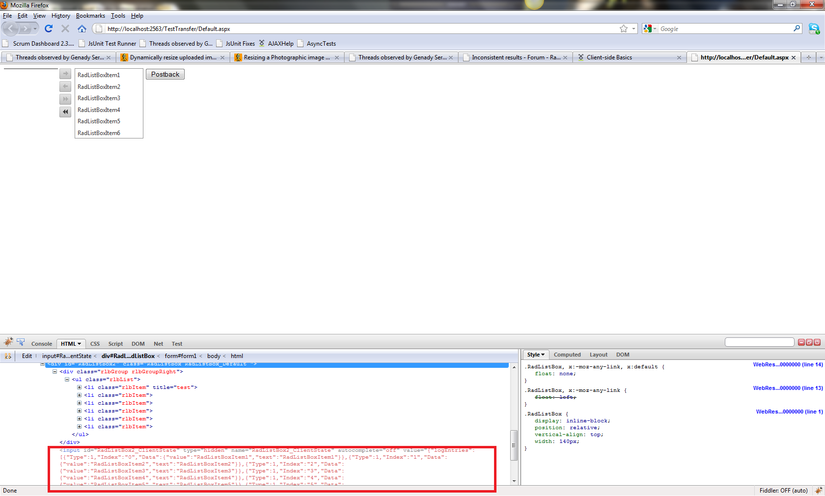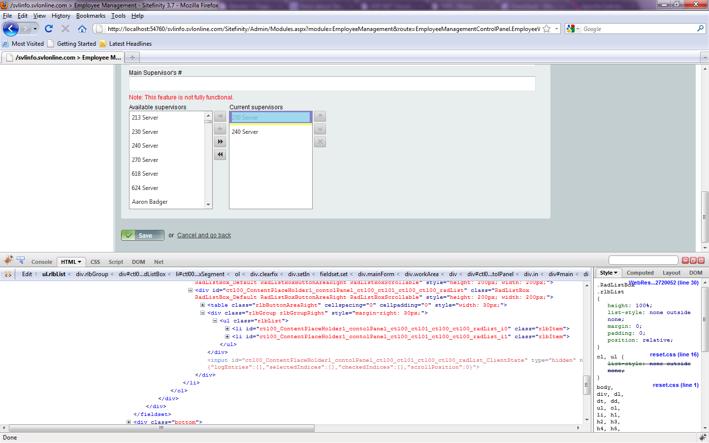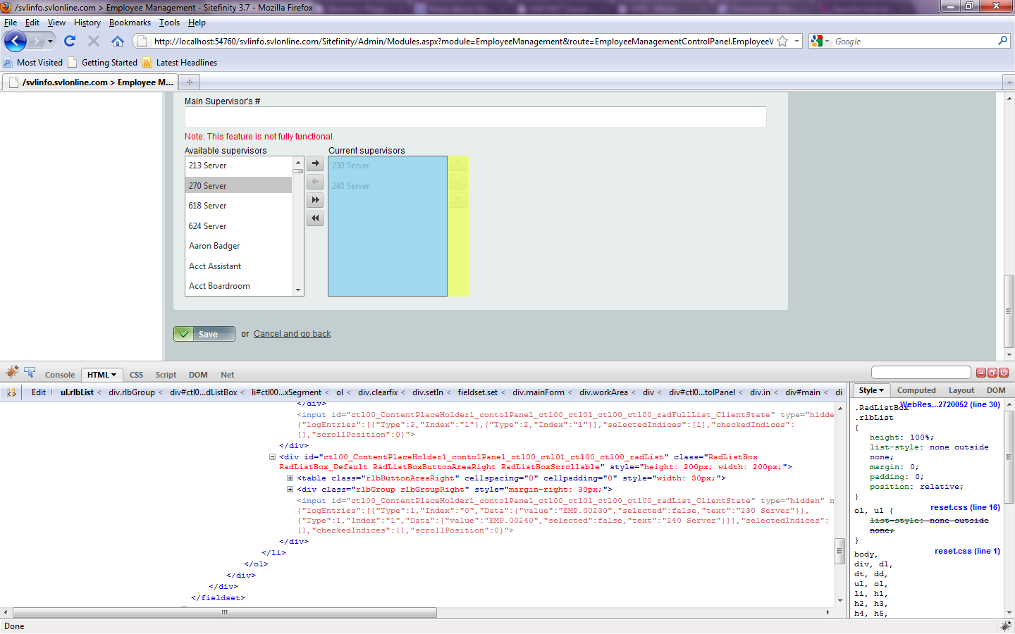 I have two list boxes (radFullList and radList) which are linked together for AllowTransfer. Not that it matters but the first listbox is a list of employee names, the value is their employee number. The second listbox is for holding the employee's supervisors so when you move an items from radFullList to radList it maintains the same format, employee name and employee number in the value.EmployeeEditView.ascx