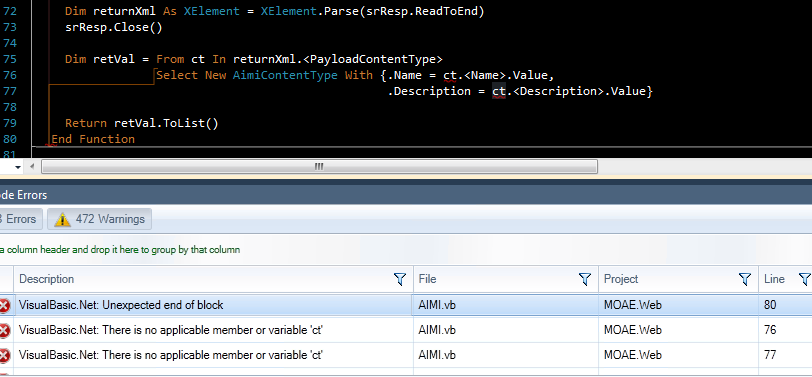Dim retVal = From ct In returnXml.<PayloadContentType> Select New AimiContentType With {.Name = ct.<Name>.Value, .Description = ct.<Description>.Value}Return retVal.ToList()I have just downloaded and installed JustCode (2011.2.916.0) and it gives me the following errors: