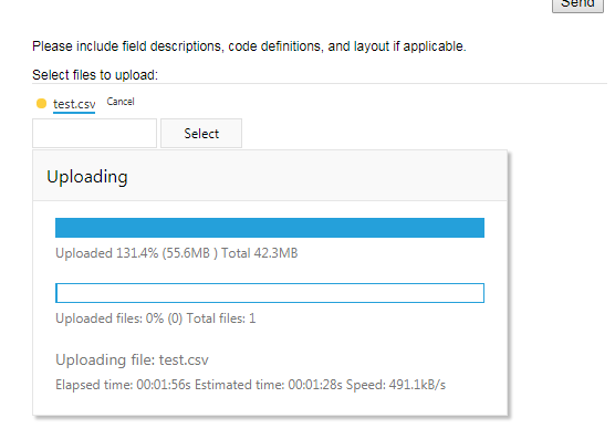 Any idea what may be causing the progress area to go above 100% and actually never stop? See screenshot. The file is uploaded successfully, but the user is never told that.