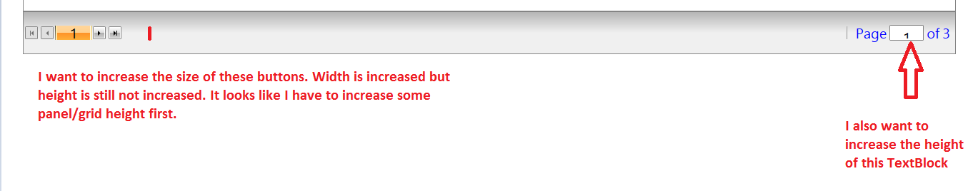 I want to increase the height and width of the Rad Data Pager's buttons and the TextBlock. As it is very small in sizing. As I am trying to give some custom style but still I do not know how to increase its Height. Please help me.