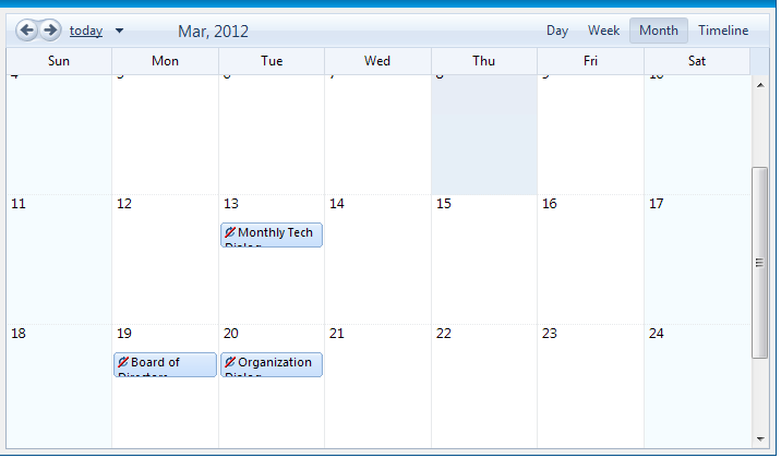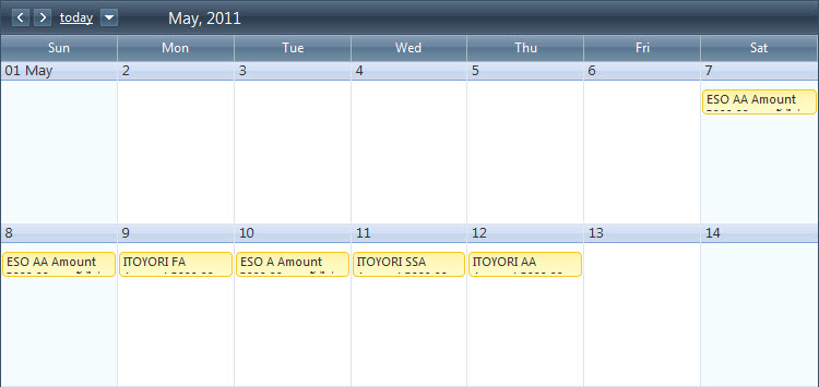 <style type="text/css"> .rsMonthView .rsWrap { height: 50px !important; } .rsMonthView .rsDateWrap { height: 24px !important; } .rsMonthView .rsLastWrap { height: 24px !important; } .rsMonthView .rsApt { height: 48px !important; } .RadScheduler_Default { height:150px !important; } </style> <telerik:RadAjaxManager ID="RadAjaxManager1" runat="server"> <AjaxSettings> <telerik:AjaxSetting AjaxControlID="RadScheduler1"> <UpdatedControls> <telerik:AjaxUpdatedControl ControlID="RadScheduler1" LoadingPanelID="RadAjaxLoadingPanel1" /> </UpdatedControls> </telerik:AjaxSetting> </AjaxSettings> </telerik:RadAjaxManager> <telerik:RadAjaxLoadingPanel ID="RadAjaxLoadingPanel1" runat="server" /> <telerik:RadScheduler runat="server" ID="RadScheduler1" Width="750px" Height="600px" SelectedView="MonthView" Skin="WebBlue" TimeZoneOffset="00:00:00" SelectedDate="2011-05-01" AllowDelete="False" AllowEdit="False" AllowInsert="False" DayView-UserSelectable="false" WeekView-UserSelectable="false" OverflowBehavior="Expand" VisibleAppointmentsPerDay="1" DataSourceID="SqlDataSource_Plan" DataKeyField="planNo" DataSubjectField="subject" DataStartField="startDate" DataEndField="endDate" DataDescriptionField="status" > <AdvancedForm Modal="true" /> <TimelineView UserSelectable="false" /> <TimeSlotContextMenuSettings EnableDefault="False" /> <AppointmentContextMenuSettings EnableDefault="False" /> <MonthView UserSelectable="False"></MonthView> </telerik:RadScheduler>Thanks