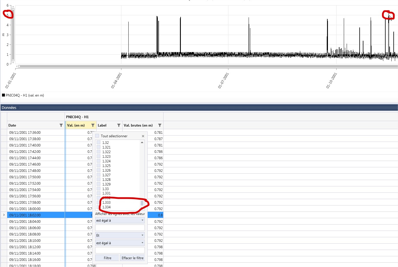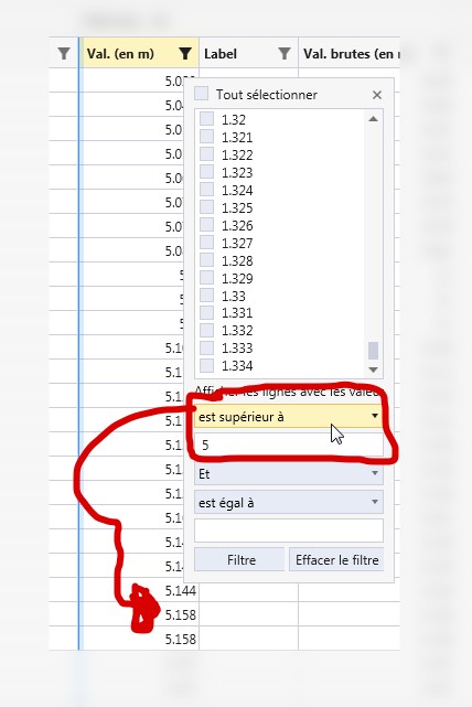 When i choosed "superior to 5" in this same filter (screen '2'), I can see my values on my grid.