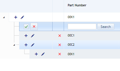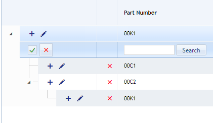 <telerik:RadTreeList RenderMode="Lightweight" runat="server" ID="radTree" DataKeyNames="ID,PartNum" ParentDataKeyNames="ParentID,ParentPartNum" AutoGenerateColumns="false" EditMode="InPlace" OnNeedDataSource="radTree_NeedDataSource" OnItemDataBound="radTree_ItemDataBound" OnUpdateCommand="radTree_UpdateCommand" OnDeleteCommand="radTree_DeleteCommand" OnInsertCommand="radTree_InsertCommand" OnItemCreated="radTree_ItemCreated" OnItemSelected="" OnItemCommand="radTree_ItemCommand" OnTreeShowingEditor="" ExpandCollapseMode="Server" Width="100%" Skin="Windows7"> <Columns> <telerik:TreeListEditCommandColumn UniqueName="EditCommandColumn" ButtonType="FontIconButton" HeaderStyle-Width="80px" AddRecordText="Add child part" EditText="Edit part"> </telerik:TreeListEditCommandColumn> <telerik:TreeListButtonColumn UniqueName="DeleteCommandColumn" Text="Delete" CommandName="Delete" HeaderStyle-Width="40px" ButtonType="FontIconButton" ToolTip="Delete part"> </telerik:TreeListButtonColumn> <telerik:TreeListBoundColumn DataField="ParentID" HeaderText="ParentID" UniqueName="ParentPath" Visible="false"> <HeaderStyle Width="200px"></HeaderStyle> </telerik:TreeListBoundColumn> <telerik:TreeListBoundColumn DataField="ParentPartNum" HeaderText="ParentPartNum" UniqueName="ParentPartNum" Visible="false"> <HeaderStyle Width="200px"></HeaderStyle> </telerik:TreeListBoundColumn> <telerik:TreeListBoundColumn DataField="ID" HeaderText="ID" UniqueName="ID" Visible="false"> <HeaderStyle Width="200px"></HeaderStyle> </telerik:TreeListBoundColumn> <telerik:TreeListTemplateColumn UniqueName="PartNum" DataField="PartNum" HeaderText="Part Number" HeaderStyle-Width="300px"> <ItemTemplate> <asp:Literal Text='<%#Eval("PartNum").ToString() %>' runat="server" ID="PartNum"></asp:Literal> </ItemTemplate> <EditItemTemplate> <div style="display: inline-block"> <telerik:RadTextBox ID="txtPartNum" runat="server" Width="100px" Text='<%# Bind("PartNum")%>' /> <telerik:RadButton ID="radBtnSearch" runat="server" Text="Search" CommandName="openSearchErpPart" OnClientClicking="openSearchErpPart" /> </div> </EditItemTemplate> </telerik:TreeListTemplateColumn> </Columns> <ClientSettings> <Scrolling AllowScroll="true" UseStaticHeaders="true" SaveScrollPosition="true" ScrollHeight="400px" /> <Selecting AllowItemSelection="true" /> <ClientEvents OnItemClick="itemClick" /> </ClientSettings></telerik:RadTreeList>
