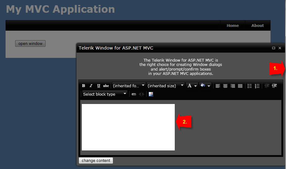 <p style="text-align: center"> The Telerik Window for ASP.NET MVC is<br /> the right choice for creating Window dialogs<br /> and alert/prompt/confirm boxes<br /> in your ASP.NET MVC applications. </p> <%= Html.Telerik().Editor().Name("comment")%> <input type="button" onclick="changeContent()" value="change content" />When I run it in IE9, I immediately see two bugs (see attached screenshot):