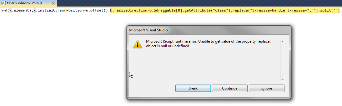 <% Html.Telerik().Window() .Name("Window") .Title("Telerik Window for ASP.NET MVC") .Draggable(true) .Resizable(resizing => resizing .Enabled(true) ) .Modal(true) .Width(500) .Scrollable(true) .Buttons(b => b.Maximize().Close()) .Content(() => {%> <p style="text-align: center"> The Telerik Window for ASP.NET MVC is<br /> the right choice for creating Window dialogs<br /> and alert/prompt/confirm boxes<br /> in your ASP.NET MVC applications. </p> <%= Html.Telerik().Editor().Name("comment")%> <input type="button" onclick="changeContent()" value="change content" /> <%}) .Render(); %>...and then try to resize the window from the bottom right, I get the attached Javascript error in telerik.window.min.js. I seem to hit a bug within 10 seconds, everytime I use the Telerik MVC extensions.