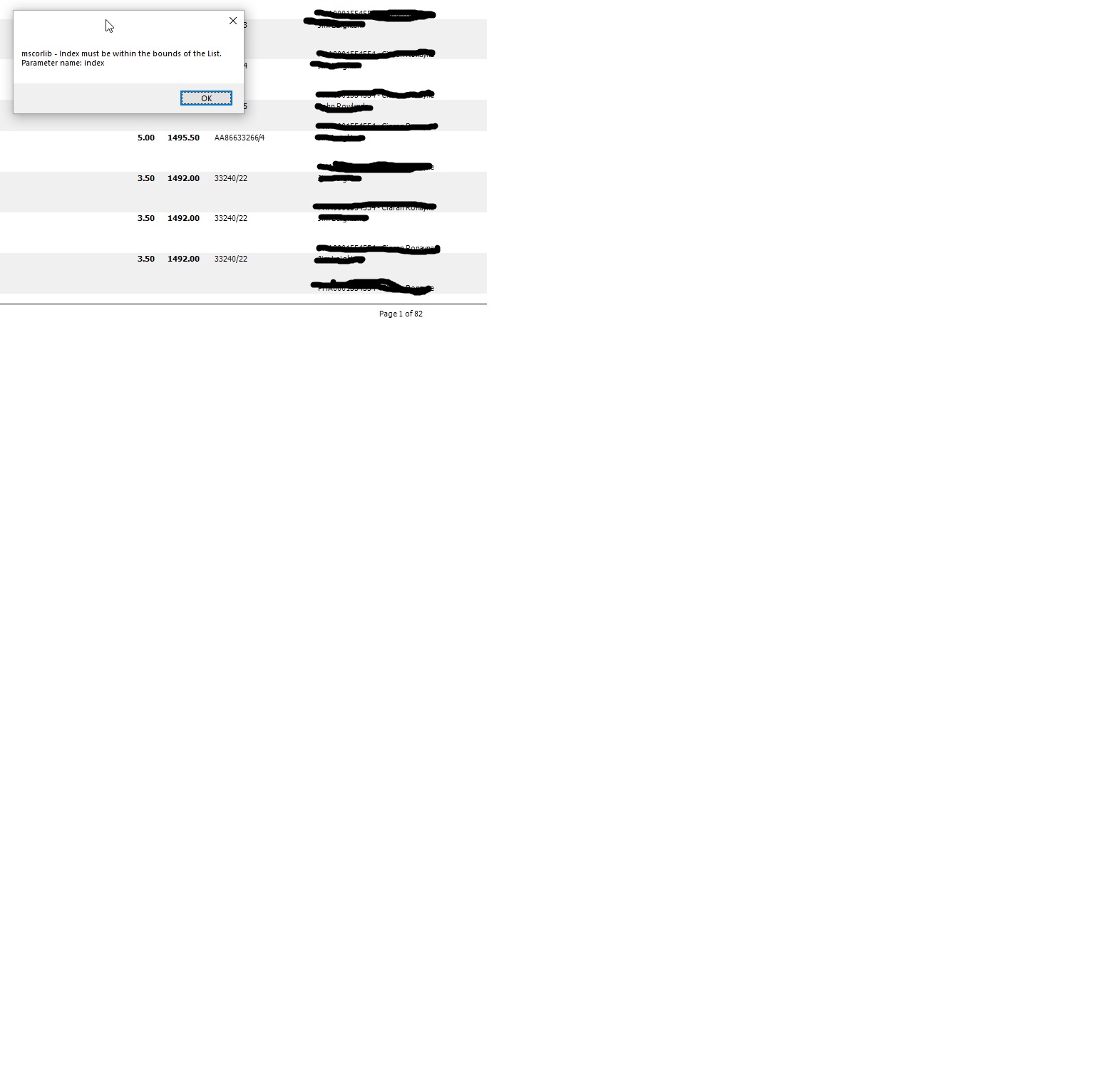 Report shows all records in Visual Studio when I Preview it in the preview page but when running the winform application from the IDE (and as a stand alone app) the viewer stops when record count ~> 220 records showing the above error. When I capture the error event and display said error in a messagebox the first page is displayed. On it I can see that pages are calculated (as my first page displays page 1 of 75) so I can conclude that the records are definitely getting retrieved, just not displayed. I say that the record count is ~> 220 because when I narrow the parameters to display < 220 records the report is generated fine: adding 10 more records to the report causes the error.