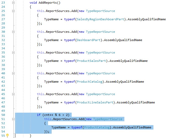 Then, at the end of the AddReports method, I added an if statement that would add another report for each of the 3 calls to AddReports every other time the ReportBook is generated. See image02.jpg. The highlighted code is what was added.