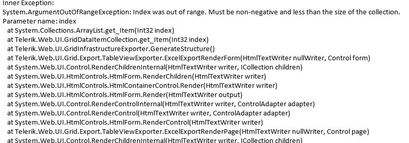 If there are no records in the grid, I get an index out of range error on clicking the export button. All other formats work fine. They just output an empty file but does not error out. I am unable to figure out why I get an index out of range error on the "biff" format export. Attached is the error details.