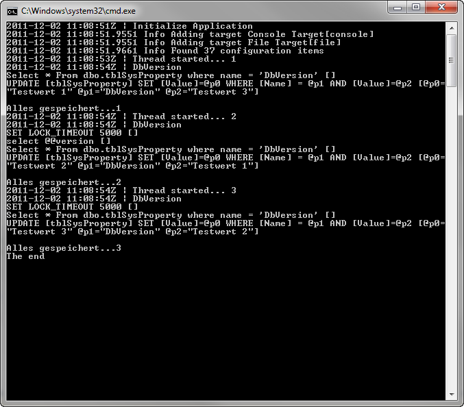 internal class Program { public static int i=0; public static Object lockvar = ""; // Lock-Variable private static void Main(string[] args) { CheckTime("Initialize Application"); AppInitializer.InitializeApp(); Task t1 = new Task(DoIt); Task t2 = new Task(DoIt); Task t3 = new Task(DoIt); t1.Start(); t2.Start(); t3.Start(); Task.WaitAll(t1, t2, t3); Console.WriteLine("The end"); Console.ReadLine(); } public static void DoIt() { Thread.Sleep(2000); //simulate longer running task... lock ( lockvar ) { string mystring = "Thread started... "; i++; mystring += i; CheckTime(mystring); using ( IRepository<SysProperty> rep = App.Instance.GetService<IRepository<SysProperty>>() ) { rep.AutoCommit = false; var o = rep.AdoGetSql("Select * From dbo.tblSysProperty where name = 'DbVersion'"); CheckTime(o.First().Name.ToString()); o.First().Value = "Testwert " + i.ToString(); rep.SaveChanges(); Console.WriteLine(rep.LogOutput); } //Repository.SaveChanges(); System.Console.WriteLine("Alles gespeichert...{0}", i.ToString()); } } private static void CheckTime(string Info) { Console.WriteLine("{0} | {1}", DateTime.Now.ToString("u"), Info.ToString()); } }How does OA handle that?