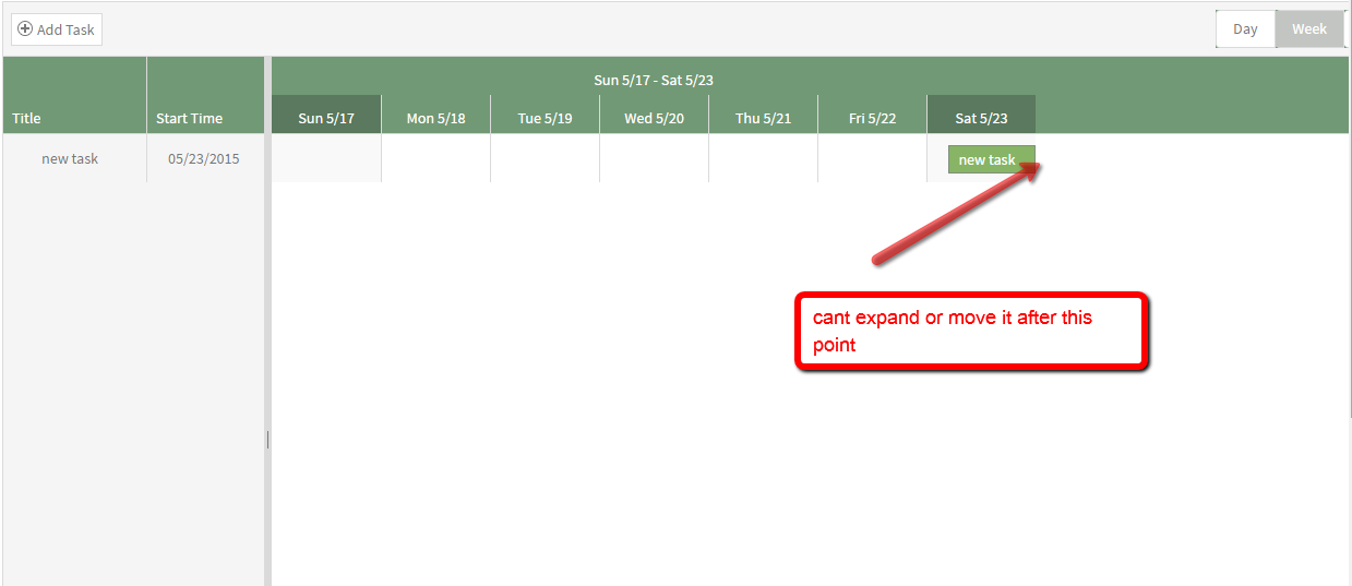 for now if I start gantt with only item with duration of 1 day and the view is on week/month, timeline is 1 week and have lots of empty space at the right side. expanding item length ( expanding duration in the timeline ) is only possible in the range of that week, while if I change item end date from datepicker on list at the left timeline expands with no problem. same problem is while moving item to timeline, I cant move it more than initial week.