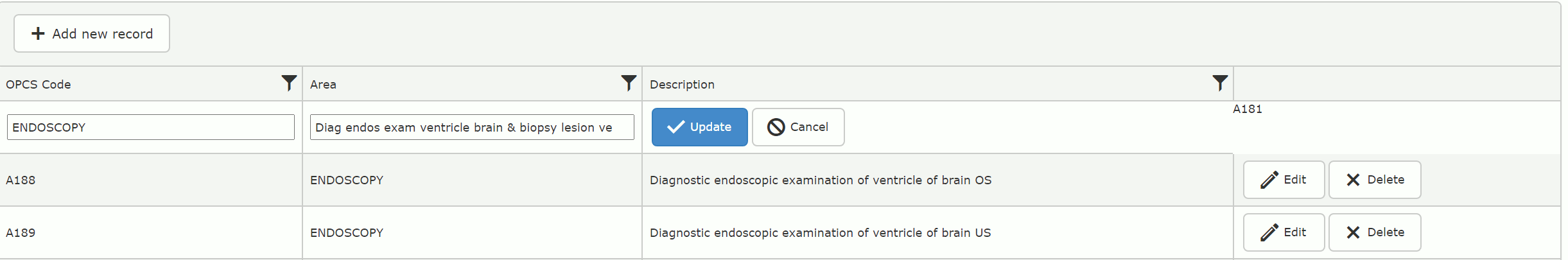 @(Html.Kendo().Grid<UHB_Waiting_Times_Portal.Models.REF_Diagnostic_Procedures>() .Name("Grid") .Columns(col => { col.Bound(o => o.OPCS).Title("OPCS Code"); col.Bound(o => o.Area).Title("Area"); col.Bound(o => o.OPCS_Description).Title("Description"); col.Command(command => { command.Edit(); command.Destroy(); }); }) .ToolBar(commands => commands.Create()) .Editable(editable => editable .Mode(GridEditMode.InLine)) .DataSource(ds => ds .Ajax() .Events(e=>e.Error("errorH")) .Model(m=>{ m.Id(p => p.OPCS); //m.Field(p => p.OPCS).Editable(false); }) .PageSize(20) .Read(rd => rd.Action("RD_Procedures", "DiagnosticProcedures") ) .Create(create => create.Action("InsertProcedure", "DiagnosticProcedures")) .Update(update => update.Action("UpdateProcedure", "DiagnosticProcedures")) .Destroy(delete => delete.Action("DeleteProcedure", "DiagnosticProcedures")) ) .Events(e=>e.Edit("gridEdit")) .Pageable() .Sortable() .Filterable() )The commented out line is what I'm trying to replicate, but just for edits