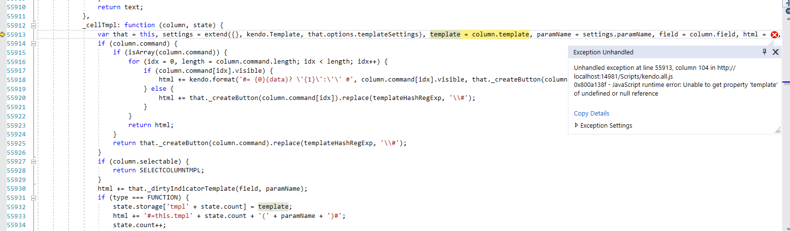 "Unhandled exception at line 54, column 9287 in http://localhost:14981/Scripts/kendo.all.min.js