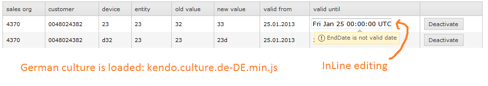 @(Html.Kendo().Grid<Roche.LabData.Web.Models.MappingRuleViewModel>() .Name("Grid") .Columns(columns => { columns.Bound(m => m.SalesOrganization); columns.Bound(m => m.CustomerNumber); columns.Bound(m => m.DeviceName); columns.Bound(m => m.EntityName); columns.Bound(m => m.OldValue); columns.Bound(m => m.NewValue); columns.Bound(m => m.StartDate).Format("{0:d}"); columns.Bound(m => m.EndDate).Format("{0:d}"); columns.Command(command => command.Custom("Deactivate").Click("clickDeactivate")); }) .Editable(editable => editable.Mode(GridEditMode.InCell)) .Pageable() .Sortable() .DataSource(dataSource => dataSource .Ajax() .ServerOperation(false) .Read(read => read.Action("MappingRules_Read", "MappingRules")) .Update(read => read.Action("MappingRules_Update", "MappingRules")) .Events(events => events.Error("error_handler")) .Model(model => { model.Id(m => m.MappingRuleId); model.Field(p => p.SalesOrganization).Editable(false); model.Field(p => p.CustomerNumber).Editable(false); model.Field(p => p.DeviceName).Editable(false); model.Field(p => p.EntityName).Editable(false); model.Field(p => p.OldValue).Editable(false); model.Field(p => p.NewValue).Editable(false); model.Field(p => p.StartDate).Editable(false); // This column should be "InPlace editable" model.Field(p => p.EndDate).Editable(true); }) ) )My ViewModel looks like this: