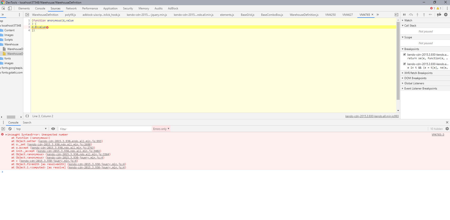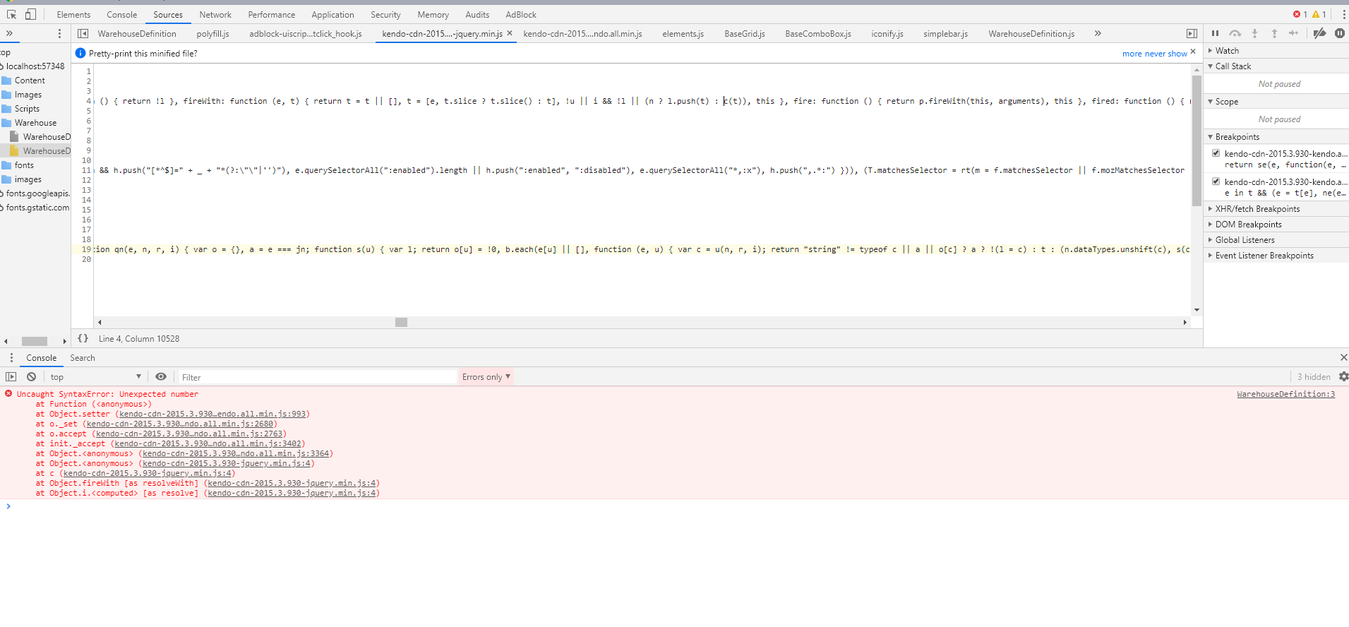 01.function userNameEditor(container, options) {02. debugger;03. var gridDataSource = new kendo.data.DataSource({04. transport: {05. read: {06. url: '../Warehouse/SearchUser',07. dataType: "json"08. },09. success: function(e) {10. debugger;11. },12. error: function (e) {13. debugger;14. }15. }16. });17. var cmb=$('<input name="' + options.field + '"/>')18. .appendTo(container)19. .kendoComboBox({20. autoBind: false,21. dataTextField: "UserFullName",22. dataValueField: "Id",23. filter: "contains",24. minLength: 3,25. dataSource: gridDataSource,26. filtering: function (e) {27. 28. var filter = e.filter;29. gridDataSource.read({ userSearchText: filter.value });30. //dataSource.filter({ userSearchText: filter.value });31. },32. dataBound: function (e) {33. debugger;34. var equipmentData = e.sender.dataSource.data();35. 36. 37. $.each(equipmentData, function (index, selectedEquipmentData) {38. var dataItem = e.sender.dataSource.at(index);39. 40. });41. },42. select: function(e) {43. debugger;44. this.refresh();45. },46. complete: function(e) {47. debugger;48. },49. error: function(e) {50. debugger;51. }52. }).data('kendoComboBox');53. cmb.refresh();54. 69.};