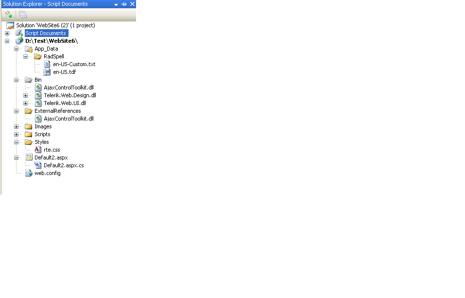 The inline spell check doesn't work, but explicit call to the AJAXSpellEdit does work properly. I have followed the instruction to copy the dictionary files to App_Data/RadSpell, add the handler in web.config.