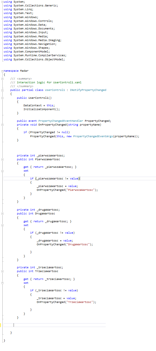 private int _pierwszaWartosc;<br> public int PierwszaWartosc<br> {<br> get { return _pierwszaWartosc; }<br> set<br> {<br> if (_pierwszaWartosc != value)<br> {<br> _pierwszaWartosc = value;<br> OnPropertyChanged("PierwszaWartosc"); <br> }<br> }<br> }<br><br> private int _drugaWartosc;<br> public int DrugaWartosc<br> {<br> get { return _drugaWartosc; }<br> set<br> {<br> if (_drugaWartosc != value)<br> {<br> _drugaWartosc = value;<br> OnPropertyChanged("DrugaWartosc");<br><br> }<br> }<br> }<br><br> private int _trzeciaWartosc;<br> public int TrzeciaWartosc<br> {<br> get { return _trzeciaWartosc; }<br> set<br> {<br> if (_trzeciaWartosc != value)<br> {<br> _trzeciaWartosc = value;<br> OnPropertyChanged("TrzeciaWartosc");<br><br> }<br> }<br> }