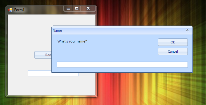 class RadInputBox{ public static string Show(string Prompt, string Title, string DefaultResponse = "") { RadInputBoxInternal inputBox = new RadInputBoxInternal(); inputBox.StartPosition = FormStartPosition.CenterParent; inputBox.LabelQuestion.Text = Prompt; inputBox.Text = Title; if (inputBox.ShowDialog() == DialogResult.OK) { return inputBox.TextBoxInput.Text; } else { return DefaultResponse; } } private class RadInputBoxInternal : Telerik.WinControls.UI.RadForm { internal RadInputBoxInternal() { Shown += RadForm1_Shown; this.InitializeComponent(); } [System.Diagnostics.DebuggerNonUserCode()] protected override void Dispose(bool disposing) { try { if (disposing && components != null) { components.Dispose(); } } finally { base.Dispose(disposing); } } private System.ComponentModel.IContainer components; [System.Diagnostics.DebuggerStepThrough()] private void InitializeComponent() { this.ButtonOk = new Telerik.WinControls.UI.RadButton(); this.ButtonCancel = new Telerik.WinControls.UI.RadButton(); this.TextBoxInput = new Telerik.WinControls.UI.RadTextBox(); this.LabelQuestion = new Telerik.WinControls.UI.RadLabel(); ((System.ComponentModel.ISupportInitialize)this.ButtonOk).BeginInit(); ((System.ComponentModel.ISupportInitialize)this.ButtonCancel).BeginInit(); ((System.ComponentModel.ISupportInitialize)this.TextBoxInput).BeginInit(); ((System.ComponentModel.ISupportInitialize)this.LabelQuestion).BeginInit(); ((System.ComponentModel.ISupportInitialize)this).BeginInit(); this.SuspendLayout(); // //ButtonOk // this.ButtonOk.Location = new System.Drawing.Point(342, 12); this.ButtonOk.Name = "ButtonOk"; this.ButtonOk.Size = new System.Drawing.Size(97, 24); this.ButtonOk.TabIndex = 0; this.ButtonOk.Text = "Ok"; // //ButtonCancel // this.ButtonCancel.DialogResult = System.Windows.Forms.DialogResult.Cancel; this.ButtonCancel.Location = new System.Drawing.Point(342, 42); this.ButtonCancel.Name = "ButtonCancel"; this.ButtonCancel.Size = new System.Drawing.Size(97, 24); this.ButtonCancel.TabIndex = 1; this.ButtonCancel.Text = "Cancel"; // //TextBoxInput // this.TextBoxInput.Location = new System.Drawing.Point(13, 87); this.TextBoxInput.Name = "TextBoxInput"; this.TextBoxInput.Size = new System.Drawing.Size(426, 20); this.TextBoxInput.TabIndex = 2; this.TextBoxInput.TabStop = false; // //LabelQuestion // this.LabelQuestion.AutoSize = false; this.LabelQuestion.Location = new System.Drawing.Point(13, 12); this.LabelQuestion.Name = "LabelQuestion"; this.LabelQuestion.Size = new System.Drawing.Size(323, 69); this.LabelQuestion.TabIndex = 3; this.LabelQuestion.Text = "text"; // //RadForm1 // this.AcceptButton = this.ButtonOk; this.AutoScaleDimensions = new System.Drawing.SizeF(6f, 13f); this.AutoScaleMode = System.Windows.Forms.AutoScaleMode.Font; this.CancelButton = this.ButtonCancel; this.ClientSize = new System.Drawing.Size(451, 119); this.Controls.Add(this.LabelQuestion); this.Controls.Add(this.TextBoxInput); this.Controls.Add(this.ButtonCancel); this.Controls.Add(this.ButtonOk); this.FormBorderStyle = System.Windows.Forms.FormBorderStyle.FixedDialog; this.MaximizeBox = false; this.MinimizeBox = false; this.Name = "RadInputInternal"; // // // this.RootElement.ApplyShapeToControl = true; this.Text = "RadInputInternal"; ((System.ComponentModel.ISupportInitialize)this.ButtonOk).EndInit(); ((System.ComponentModel.ISupportInitialize)this.ButtonCancel).EndInit(); ((System.ComponentModel.ISupportInitialize)this.TextBoxInput).EndInit(); ((System.ComponentModel.ISupportInitialize)this.LabelQuestion).EndInit(); ((System.ComponentModel.ISupportInitialize)this).EndInit(); this.ResumeLayout(false); this.PerformLayout(); } private Telerik.WinControls.UI.RadButton withEventsField_ButtonOk; internal Telerik.WinControls.UI.RadButton ButtonOk { get { return withEventsField_ButtonOk; } set { if (withEventsField_ButtonOk != null) { withEventsField_ButtonOk.Click -= ButtonOk_Click; } withEventsField_ButtonOk = value; if (withEventsField_ButtonOk != null) { withEventsField_ButtonOk.Click += ButtonOk_Click; } } } private Telerik.WinControls.UI.RadButton withEventsField_ButtonCancel; internal Telerik.WinControls.UI.RadButton ButtonCancel { get { return withEventsField_ButtonCancel; } set { if (withEventsField_ButtonCancel != null) { withEventsField_ButtonCancel.Click -= ButtonCancel_Click; } withEventsField_ButtonCancel = value; if (withEventsField_ButtonCancel != null) { withEventsField_ButtonCancel.Click += ButtonCancel_Click; } } } internal Telerik.WinControls.UI.RadTextBox TextBoxInput; internal Telerik.WinControls.UI.RadLabel LabelQuestion; private void RadForm1_Shown(System.Object sender, System.EventArgs e) { this.TextBoxInput.SelectionLength = 0; this.TextBoxInput.Focus(); } private void ButtonCancel_Click(System.Object sender, System.EventArgs e) { this.DialogResult = System.Windows.Forms.DialogResult.Cancel; this.Close(); } private void ButtonOk_Click(System.Object sender, System.EventArgs e) { this.DialogResult = DialogResult.OK; this.Close(); } }}and here is how to use it: