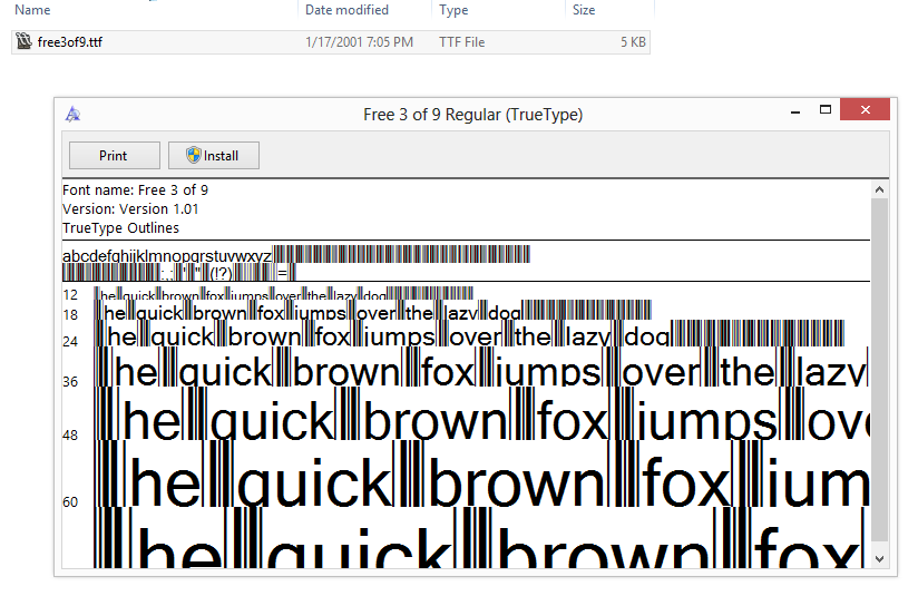 The first project is in the attached archive "BarcodeWithPdfFont.zip". This demo generally shows that the barcode content can actually be generated using an appropriate font file. When you draw the barcode text with the corresponding font it is displayed in the PDF file as a barcode. You may additionally notice that when you export the barcode you may later select it in the PDF file and when you copy and paste it in Notepad, for instance, you will be able to read the barcode text. In order to test this demo, you need to download a font called "free3of9" and install it on your machine. This font file may found for free download when searching it on the web (for example I have found it on the following link). On the attached screenshot "install-free3of9-font-using-windowsFontViewer.png" you may see the install button which should be available when you double-click the font file. If your application cannot rely on the font file being installed on the machine, you can alternatively register the font data through FontRepository class. This can be achieved by making the font file resource to your project and passing the file's byte array to FontRepository's RegisterFont method. More information on fonts you may find on this link to fonts documentation article.