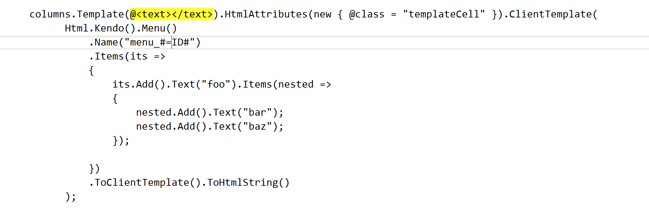 @(Html.Kendo().Grid<KendoGridAjaxBinding.Models.Product>() .Name("grid") .HtmlAttributes(new { min_height = "200px", tabIndex = "0" }) .DataSource(dataSource => dataSource // Configure the grid data source .Ajax() // Specify that ajax binding is used .Read(read => read.Action("Products_Read", "Home")) // Set the action method which will return the data in JSON format ) .Columns(columns => { // Create a column bound to the ProductID property columns.Bound(product => product.ProductID); // Create a column bound to the ProductName property columns.Bound(product => product.ProductName); columns.Template(@<text></text>).HtmlAttributes(new { @class = "templateCell" }).ClientTemplate( Html.Kendo().Menu() .Name("menu_#=ProductID#") .Items(its => { its.Add().Text("foo").Items(nested => { nested.Add().Text("bar"); nested.Add().Text("baz"); }); }) .ToClientTemplate().ToHtmlString() ); // Create a column bound to the UnitsInStock property columns.Bound(product => product.UnitsInStock);}) .Events(ev => ev.DataBound("initMenus")))<script type="text/javascript"> function initMenus(e) { $(".templateCell").each(function () { eval($(this).children("script").last().html()); }); } </script>In my Product model there is a ProductID property. The following syntax