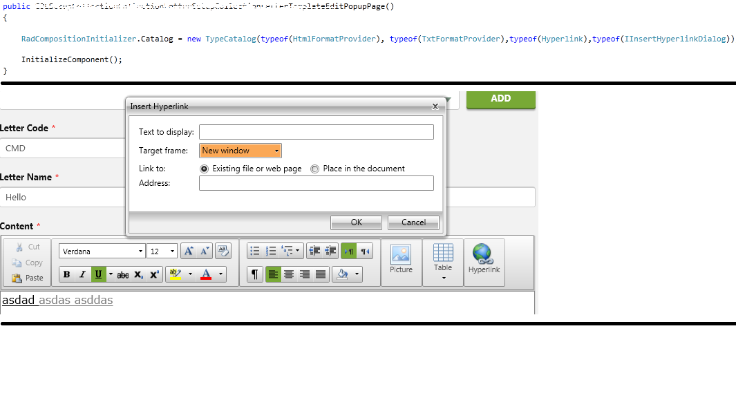 I am having the issue of loading the page of the Richtextbox which take around 15 seconds to completely load the page. So, I insert the code as follow(picture is attached in this post): RadCompositionInitializer.Catalog = new TypeCatalog(typeof(HtmlFormatProvider), typeof(TxtFormatProvider),typeof()Hyperlink),typeof(IInsertHyperlinkDialog));