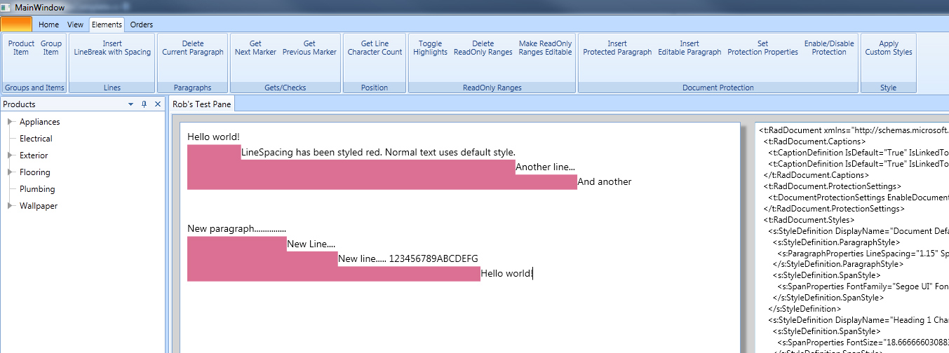 public static void AddStylesToDocumentRepository(RadDocument document){ document.StyleRepository.Add(ParagraphEditableGroup()); document.StyleRepository.Add(ParagraphRoomReadOnly()); document.StyleRepository.Add(LineBreakSpacing());}LineBreak Style Definition: