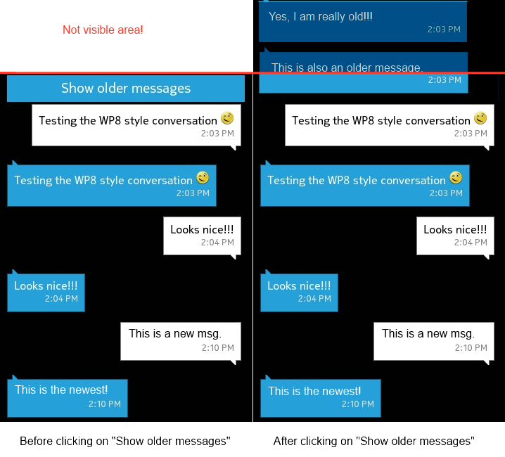 When I add those earlier messages (20 previous messages) I add them to the ItemSource by doing an ItemSource.Insert(0, newMessage).