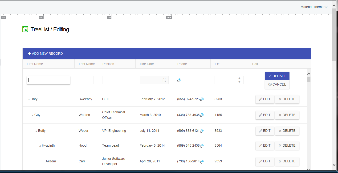In the Editing example, (screenshot attached) if the user clicks on Add New Record, a new blank line appears at the top of the TreeList, therefore the new entry would be at the root. How would I go about it, if I wanted to add someone under Buffy (using the sample data)? I understand, I could have the user add a new row, then drag and drop the new value anywhere in the hierarchy, but I have a few issues with that. First, I don't think it's a great user experience for the user to have to do that. Secondly, and more importantly, we have business rules that don't allow people add a value to the root level.