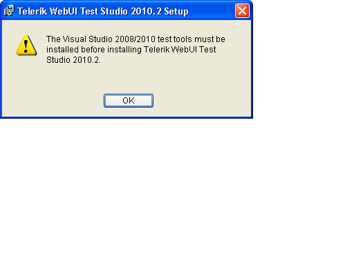 I am trying to install Trail version of WebUI Test Studio Developer 10.2 on Windows XP. I have installed Visual Studio 2008 Professional and try to install the tool. I am getting an error saying that "The Visual Studio 2008/2010 test tool must be installed before installing Telerik WebUI Test studio 2010.2.