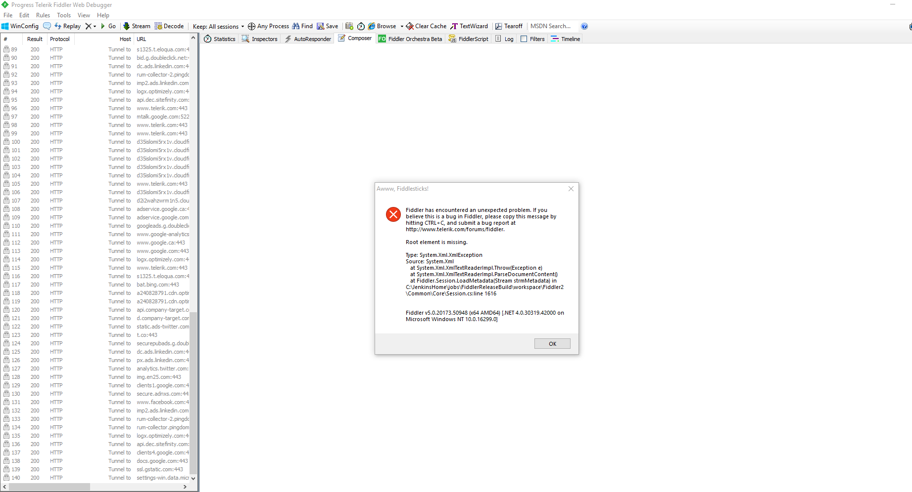 Fiddler has encountered an unexpected problem. If you believe this is a bug in Fiddler, please copy this message by hitting CTRL+C, and submit a bug report at http://www.telerik.com/forums/fiddler.