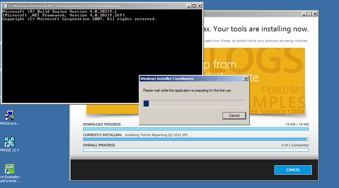 MSI (s) (68:20) [09:48:52:421]: Executing op: CustomActionSchedule(Action=BuildCSharpSampleLib2010,ActionType=3170,Source=C:\Program Files (x86)\Telerik\Reporting Q2 2012\,Target="c:\Windows\Microsoft.NET\Framework\v4.0.30319\msbuild.exe" "C:\Program Files (x86)\Telerik\Reporting Q2 2012\Examples\CSharp\CSharp.ReportExamples.VS2010.sln" /t:Rebuild /p:Configuration=Debug /noconlog,)