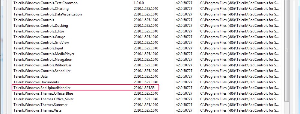 The last part of the version number is the platform version. Silverlight 3 is 1030, Silverlight 4 - 1040, WPF 3.5 - 35, WPF 4.0 - 40. Since the RadUploadHandler.dll is not a Silverlight assembly (it should be referenced in the Web project, not the Silverlight app), its version uses the WPF naming, hence the difference.