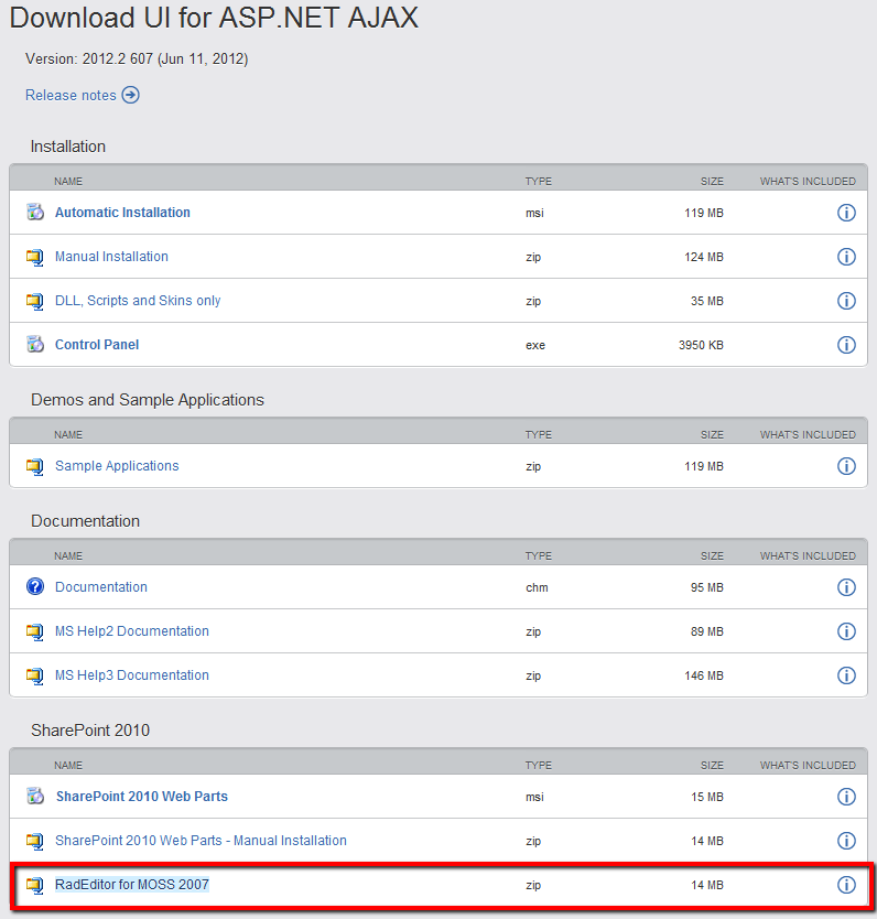 None of these packages seem to contain a file like "RadEditorMOSS_5_x_x_Dev.zip" as mentioned in the article (http://www.telerik.com/help/aspnet-ajax/moss-installing-radeditor-in-moss-2007-farm.html) you cited in your previous reply.