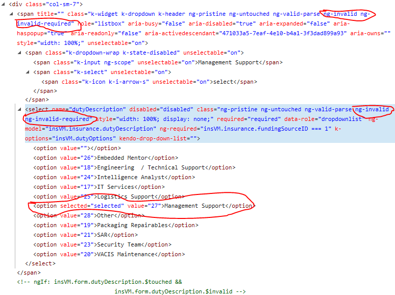 Below is a sample of the markup and controller code, and attached are screenshots that show what is in the DOM when loading fails and succeeds. Note in the screenshots how in the failed view option value 27 (the pre-existing value) is marked as selected, while in the success screenshot, value 29, the pre-existing value is not a selected option value. I have seen this symptom repeatedly when examining the output when this condition occurs. In the UI screenshot, the "Description of Duties" label is showing an error style, despite the fact that the DDL is displaying the correct value.