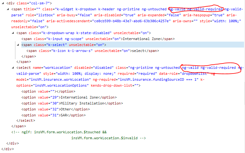 <div class="form-group" ng-class="{'has-error': insVM.form.dutyDescription.$invalid, 'required' : insVM.insurance.fundingSourceID === 1}"><label for="dutyDescription" class="col-sm-3 control-label">Description Of Duties</label><div class="col-sm-7"> <select kendo-drop-down-list name="dutyDescription" ng-required="insVM.insurance.fundingSourceID === 1" k-options="insVM.dutyOptions" ng-model="insVM.insurance.dutyDescription" style="width:100%" /><div class="help-block" ng-messages="insVM.form.dutyDescription.$error" ng-if="insVM.form.dutyDescription.$touched && insVM.form.dutyDescription.$invalid"> <div ng-messages-include="app/shared/validationMessages.html"></div></div></div></div>