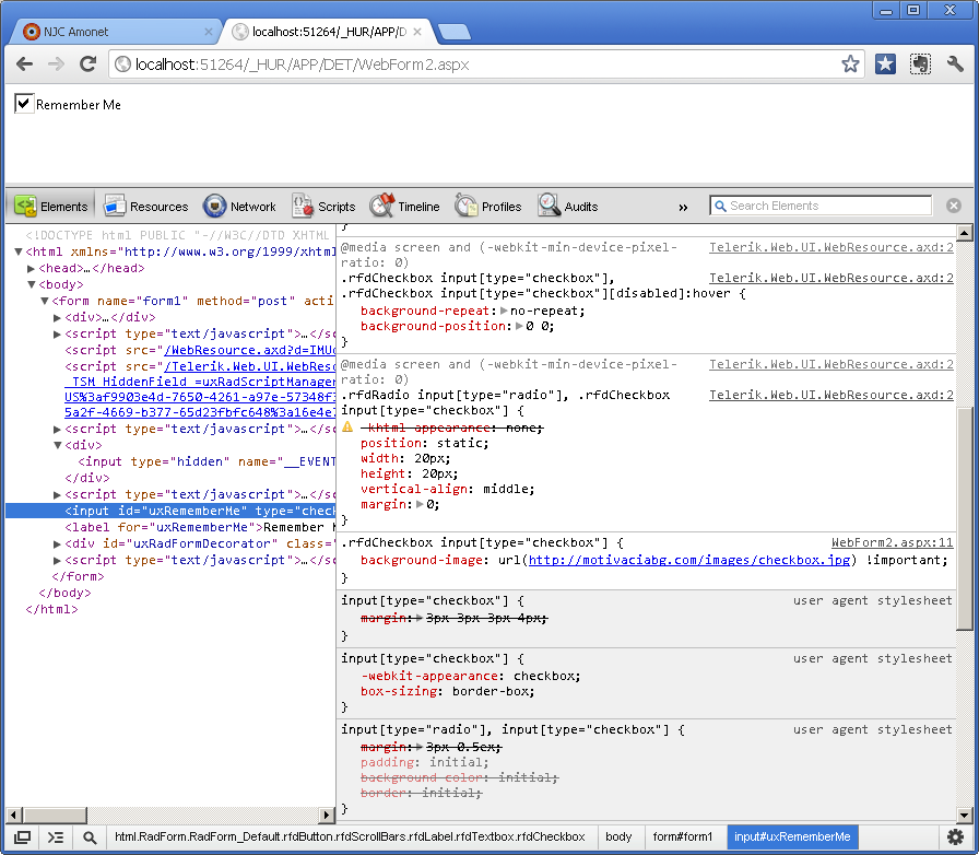 <%@ Register TagPrefix="telerik" Namespace="Telerik.Web.UI" Assembly="Telerik.Web.UI" %><!DOCTYPE html PUBLIC "-//W3C//DTD XHTML 1.0 Transitional//EN" "http://www.w3.org/TR/xhtml1/DTD/xhtml1-transitional.dtd"><html xmlns="http://www.w3.org/1999/xhtml"><head runat="server"> <title></title> <style type="text/css"> .rfdCheckbox input[type="checkbox"] { background-image: url(http://motivaciabg.com/images/checkbox.jpg) !important; } </style></head><body style="padding-right: 0px; padding-left: 0px; padding-bottom: 0px; margin: 0px; padding-top: 0px;"> <form id="Telerik" runat="server"> <telerik:RadScriptManager ID="RadScriptManager1" runat="server"> </telerik:RadScriptManager> <telerik:RadStyleSheetManager ID="uxRadStyleSheetManager" Runat="server"></telerik:RadStyleSheetManager> <asp:CheckBox ID="uxRememberMe" runat="server" Text="Remember Me"></asp:CheckBox> <telerik:RadFormDecorator ID="uxRadFormDecorator" Runat="server" DecoratedControls="CheckBoxes, Buttons, Scrollbars, Label,Textbox" /> </form></body></html>Kind regards,
