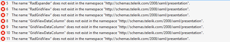Re-add the Telerik references to the project (make sure you are using the same version for all DLLs, you can find the binaries at C:\Program Files (x86)\Telerik\RadControls for WPF [version here]You can use the Telerik VS Extensions to help wit this.