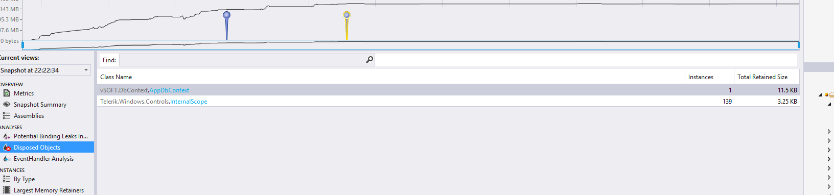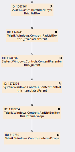 So I seem to have a memory leak. I am using JustTrace and Memory Profiler. What happens is in using the RadListBox on one of my views, I see InternalScope objects keep adding up everytime I open the view that has that RadListBox. But I don't know what that class is used for or what would make that problem? Any detailed help on how to find the root of this problem would be appreciated. Been trying to figure it out for days and have commented out templates and styles.