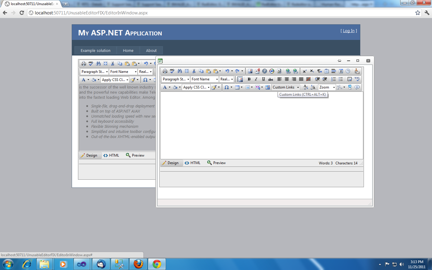 I have added the RadEditor in the RadWindow. It is working fine in all the browsers except the Google chrome and only in the specific version. It is working fine with the Chrome 11.0 but not working in the 15.0.