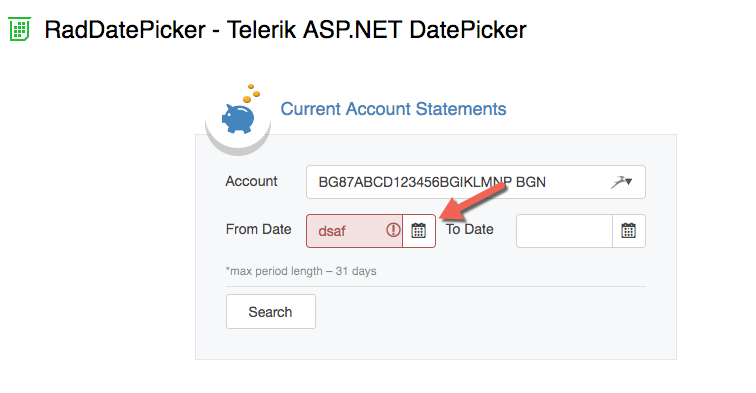 I am trying to use a RadDatePicker and when an invalid date is entered only part of the box is actually highlighted in red and the "apostrophe" icon is missing altogether. I am using the Bootstrap skin (applied in web.config). I tried removing the RequiredFieldValidator to make sure the CSS wasn't messing it up but that did not solve the problem. The demo from Telerik seems to work great with this skin. Any help would be appreciated. I have attached the demo screen shot from Telerik and from my page.