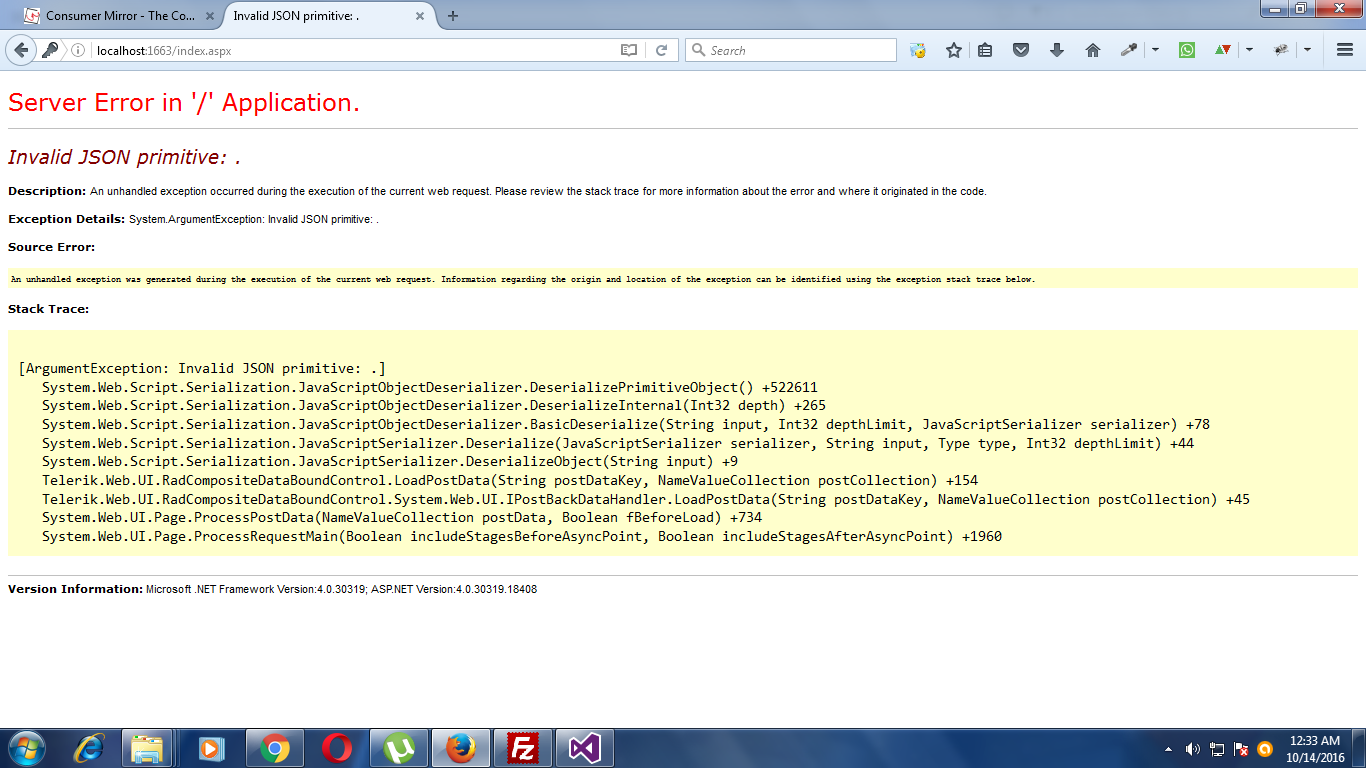 I am afraid that the provided information is not enough for us to pinpoint the cause of the problem. Can you elaborate a bit on the exact scenario in which the error is thrown? Can you to disable AJAX by setting the EnableAjax property of RadAjaxManager to false and see whether the problem persists? Is there any server-side error thrown after this?