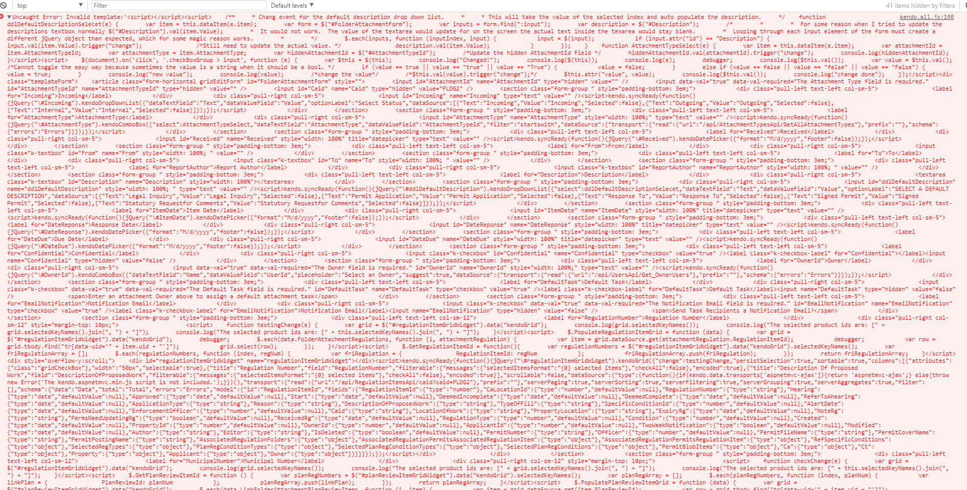 Form to create or edit a folders attachment*@@model IMSCore.ViewModels.FolderAttachmentViewModel@{ CategorySettings categorySettings = new CategorySettings(); string caid = null; if (ViewData["CategorySettings"] != null) { categorySettings = (CategorySettings)ViewData["CategorySettings"]; } if (ViewData["CAID"] != null) { caid = ViewData["CAID"].ToString(); //Model.Caid = caid; }}<script> function ddlDefaultDescriptionSelecet(e) { var item = this.dataItem(e.item); var form = $("#FolderAttachmentForm"); var inputs = form.find(":input"); var description = $("#Description"); $.each(inputs, function (inputIndex, input) { input = $(input); if (input.attr("id") == "Description") { input.val(item.Value).trigger("change"); /*Still need to update the actual value. */ description.val(item.Value); } }); } function AttachmentTypeSelect(e) { var item = this.dataItem(e.item); var attachmentId = item.AttachmentTypeId; var attachmentType = item.AttachmentType; var hiddenAttachmentId = $("#AttachmentTypeId"); /*Update the hidden AttachmentId Field */ hiddenAttachmentId.val(attachmentId).trigger("change"); console.log(hiddenAttachmentId); }</script>@* Click Event for custom Check boxes. *@<script> $(document).on('click', '.checkBoxGroup > input', function (e) { var $this = $(this); console.log("Changed!"); console.log($(this)); console.log(e); debugger; console.log($this.val()); var value = $this.val(); if (value == true || value == "true" || value == "True") { value = false; } else if (value == false || value == "false" || value == "False") { value = true; } console.log("new value"); console.log(value); /*change the value*/ /*$this.val(value).trigger("change");*/ $this.attr("value", value); console.log($this.val()); console.log("change done"); });</script><div class="templateForm"> <article class="form-horizontal gridEditForm" id="FolderAttachmentForm" style=""> @* Incase this form is ever going to be used to edit a record in the future. *@ @Html.HiddenFor(m => m.AttachmentId) @Html.HiddenFor(m => m.AttachmentTypeId) @Html.HiddenFor(m => m.Caid, new { @Value = caid }) @*@Html.Hidden("Caid", caid)*@ @* Incoming *@ <section class="form-group " style="padding-bottom: 3em;"> <div class="pull-left text-left col-sm-5"> @Html.LabelFor(m => m.Incoming) </div> <div class="pull-right col-sm-5"> @( Html.Kendo() .DropDownListFor(m => m.Incoming) .BindTo(new List<SelectListItem>() { new SelectListItem() { Text = "Incoming" }, new SelectListItem() { Text = "Outgoing" }, new SelectListItem() { Text = "Internal" } }) .DataTextField("Text") .OptionLabel("Select Status") ) </div> </section> @* Attachment Type *@ <section class="form-group " style="padding-bottom: 3em;"> <div class="pull-left text-left col-sm-5"> @Html.LabelFor(m => m.AttachmentType) </div> <div class="pull-right col-sm-5"> @( Html.Kendo() .ComboBoxFor(m => m.AttachmentType) .DataTextField("AttachmentType") .DataValueField("AttachmentTypeId") .Filter(FilterType.StartsWith) .DataSource(source => { source.Read(read => { read.Action("GetAllAttachmentTypes", "AttachmentTypesApi"); }); }) .Events(e => { e.Select("AttachmentTypeSelect"); }) .HtmlAttributes(new { style = "width: 100%;" }) ) </div> </section> @* Reveived Date *@ <section class="form-group " style="padding-bottom: 3em;"> <div class="pull-left text-left col-sm-5"> @Html.LabelFor(m => m.Received) </div> <div class="pull-right col-sm-5"> @( Html.Kendo() .DatePickerFor(m => m.Received) //.Value("10/10/2011") .HtmlAttributes(new { style = "width: 100%", title = "datepicker" }) ) </div> </section> @* From *@ <section class="form-group " style="padding-bottom: 3em;"> <div class="pull-left text-left col-sm-5"> @Html.LabelFor(m => m.From) </div> <div class="pull-right col-sm-5"> @( Html.Kendo() .TextBoxFor(m => m.From) .HtmlAttributes(new { style = "width: 100%; " }) ) </div> </section> @* To *@ <section class="form-group " style="padding-bottom: 3em;"> <div class="pull-left text-left col-sm-5"> @Html.LabelFor(m => m.To) </div> <div class="pull-right col-sm-5"> @( Html.Kendo() .TextBoxFor(m => m.To) .HtmlAttributes(new { style = "width: 100%; " }) ) </div> </section> @* Report Author *@ <section class="form-group " style="padding-bottom: 3em;"> <div class="pull-left text-left col-sm-5"> @Html.LabelFor(m => m.ReportAuthor) </div> <div class="pull-right col-sm-5"> @( Html.Kendo() .TextBoxFor(m => m.ReportAuthor) .HtmlAttributes(new { style = "width: 100%; " }) ) </div> </section> @* Description *@ <section class="form-group " style="padding-bottom: 3em;"> <div class="pull-left text-left col-sm-5"> @Html.LabelFor(m => m.Description) </div> <div class="pull-right col-sm-5"> @( Html.TextAreaFor(m => m.Description, 0, 0, new { @class = "k-textbox", style = "width: 100%" }) ) </div> </section> @* Default Description Drop down list *@ <section class="form-group " style="padding-bottom: 3em;"> <div class="pull-right col-sm-5"> @( Html.Kendo() .DropDownList() .Name("ddlDefaultDescription") .BindTo(new List<SelectListItem>() { new SelectListItem() { Text = "Legal Inquiry" }, new SelectListItem() { Text = "Permit Application" }, new SelectListItem() { Text = "Response To" }, new SelectListItem() { Text = "Signed Permit" }, new SelectListItem() { Text = "Statutory Requestfor Comments" }, }) .OptionLabel("SELECT A DEFAULT DESCRIPTION") .HtmlAttributes(new { style = "width: 100%; " }) .Events(e => { e.Select("ddlDefaultDescriptionSelecet"); }) ) </div> </section> @* Item Date *@ <section class="form-group " style="padding-bottom: 3em;"> <div class="pull-left text-left col-sm-5"> @Html.LabelFor(m => m.ItemDate) </div> <div class="pull-right col-sm-5"> @( Html.Kendo() .DatePickerFor(m => m.ItemDate) //.Value("10/10/2011") .HtmlAttributes(new { style = "width: 100%", title = "datepicker" }) ) </div> </section> @* Date Response *@ <section class="form-group " style="padding-bottom: 3em;"> <div class="pull-left text-left col-sm-5"> @Html.LabelFor(m => m.DateReponse) </div> <div class="pull-right col-sm-5"> @( Html.Kendo() .Dat