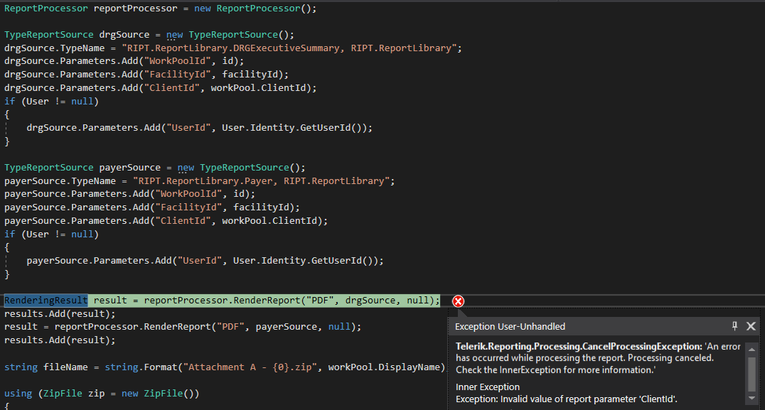 I am running up against an issue where I am unable to debug an MVC App in which I am attempting to render a couple of reports in a controller method. The code in the attached screenshot runs perfectly fine if I build and publish my Web app, but I consistently receive the "Invalid value of report parameter 'ClientId'." error when I attempt to debug the app through Visual Studio.