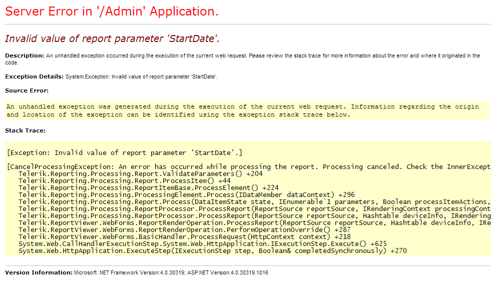 'Invalid value of report parameter ..., the DataSource property was not set.', etc.