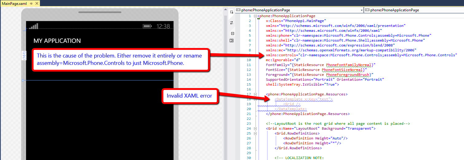 If you have the xmlns:phone declaraiton, simply delete the bad line xmlns:controls line. If you do not, then just change the assembly name from Microsoft.Phone.Controls to Microsoft.Phone and rebuild.