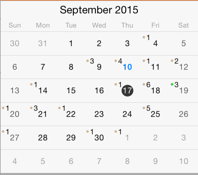 this.AddSubview (this.EventLabel); } public override void LayoutSubviews () { base.LayoutSubviews (); this.EventLabel.Frame = new CGRect (this.Frame.Size.Width - 10, this.Frame.Size.Height - 10, 10, 10); } public override void UpdateVisuals () { base.UpdateVisuals (); if (this.Events != null) { if (this.Events.Length > 0) { this.EventLabel.Text = "1"; } this.Style.TextInsets = new UIEdgeInsets (0, 25, 30, 0); this.Style.EventTextColor = new UIColor (0.4f, 0.6f, 0.8f, 1.0f); this.Style.EventShape = new TKPredefinedShape (TKShapeType.Circle, new CGSize (13, 13));