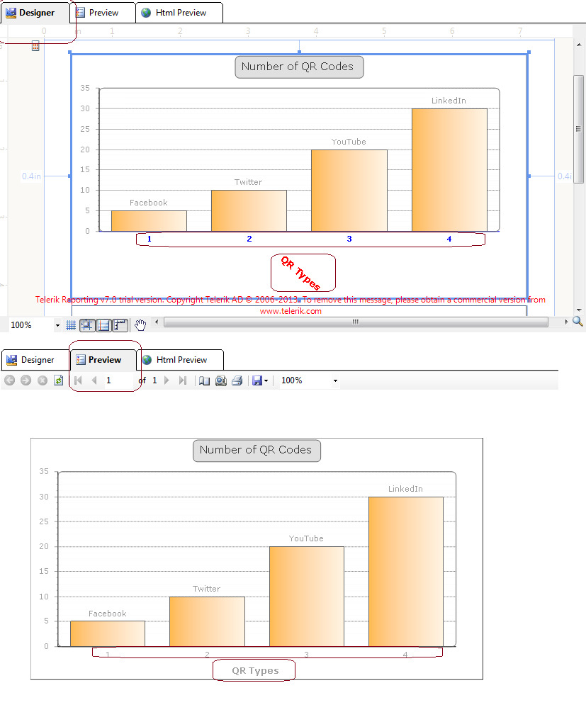 #region Component Designer generated code /// <summary> /// Required method for telerik Reporting designer support - do not modify /// the contents of this method with the code editor. /// </summary> private void InitializeComponent() { Telerik.Reporting.Charting.Styles.Corners corners1 = new Telerik.Reporting.Charting.Styles.Corners(); Telerik.Reporting.Charting.Styles.ChartMargins chartMargins1 = new Telerik.Reporting.Charting.Styles.ChartMargins(); Telerik.Reporting.Charting.Styles.Corners corners2 = new Telerik.Reporting.Charting.Styles.Corners(); Telerik.Reporting.Charting.ChartSeries chartSeries1 = new Telerik.Reporting.Charting.ChartSeries(); Telerik.Reporting.Charting.ChartSeriesItem chartSeriesItem1 = new Telerik.Reporting.Charting.ChartSeriesItem(); Telerik.Reporting.Charting.ChartSeriesItem chartSeriesItem2 = new Telerik.Reporting.Charting.ChartSeriesItem(); Telerik.Reporting.Charting.ChartSeriesItem chartSeriesItem3 = new Telerik.Reporting.Charting.ChartSeriesItem(); Telerik.Reporting.Charting.ChartSeriesItem chartSeriesItem4 = new Telerik.Reporting.Charting.ChartSeriesItem(); Telerik.Reporting.Charting.ChartSeries chartSeries2 = new Telerik.Reporting.Charting.ChartSeries(); Telerik.Reporting.Charting.ChartSeriesItem chartSeriesItem5 = new Telerik.Reporting.Charting.ChartSeriesItem(); Telerik.Reporting.Charting.ChartSeriesItem chartSeriesItem6 = new Telerik.Reporting.Charting.ChartSeriesItem(); Telerik.Reporting.Charting.ChartSeriesItem chartSeriesItem7 = new Telerik.Reporting.Charting.ChartSeriesItem(); Telerik.Reporting.Charting.ChartSeriesItem chartSeriesItem8 = new Telerik.Reporting.Charting.ChartSeriesItem(); System.ComponentModel.ComponentResourceManager resources = new System.ComponentModel.ComponentResourceManager(typeof(NumberOfQRCodesReport)); Telerik.Reporting.Drawing.StyleRule styleRule1 = new Telerik.Reporting.Drawing.StyleRule(); this.pageHeaderSection1 = new Telerik.Reporting.PageHeaderSection(); this.detail = new Telerik.Reporting.DetailSection(); this.chart1 = new Telerik.Reporting.Chart(); this.chart2 = new Telerik.Reporting.Chart(); this.sqlDataSource1 = new Telerik.Reporting.SqlDataSource(); this.pageFooterSection1 = new Telerik.Reporting.PageFooterSection(); ((System.ComponentModel.ISupportInitialize)(this)).BeginInit(); // // pageHeaderSection1 // this.pageHeaderSection1.Height = Telerik.Reporting.Drawing.Unit.Inch(0.3999999463558197D); this.pageHeaderSection1.Name = "pageHeaderSection1"; // // detail // this.detail.Height = Telerik.Reporting.Drawing.Unit.Inch(7.6000003814697266D); this.detail.Items.AddRange(new Telerik.Reporting.ReportItemBase[] { this.chart1, this.chart2}); this.detail.Name = "detail"; // // chart1 // this.chart1.AutoLayout = true; this.chart1.BitmapResolution = 96F; this.chart1.ChartTitle.Appearance.Border.Color = System.Drawing.Color.DimGray; corners1.BottomLeft = Telerik.Reporting.Charting.Styles.CornerType.Round; corners1.BottomRight = Telerik.Reporting.Charting.Styles.CornerType.Round; corners1.RoundSize = 6; corners1.TopLeft = Telerik.Reporting.Charting.Styles.CornerType.Round; corners1.TopRight = Telerik.Reporting.Charting.Styles.CornerType.Round; this.chart1.ChartTitle.Appearance.Corners = corners1; chartMargins1.Bottom = new Telerik.Reporting.Charting.Styles.Unit(14D, Telerik.Reporting.Charting.Styles.UnitType.Pixel); chartMargins1.Left = new Telerik.Reporting.Charting.Styles.Unit(0D, Telerik.Reporting.Charting.Styles.UnitType.Percentage); chartMargins1.Right = new Telerik.Reporting.Charting.Styles.Unit(10D, Telerik.Reporting.Charting.Styles.UnitType.Pixel); chartMargins1.Top = new Telerik.Reporting.Charting.Styles.Unit(4D, Telerik.Reporting.Charting.Styles.UnitType.Percentage); this.chart1.ChartTitle.Appearance.Dimensions.Margins = chartMargins1; this.chart1.ChartTitle.Appearance.FillStyle.GammaCorrection = false; this.chart1.ChartTitle.Appearance.FillStyle.MainColor = System.Drawing.Color.FromArgb(((int)(((byte)(224)))), ((int)(((byte)(224)))), ((int)(((byte)(224))))); this.chart1.ChartTitle.Appearance.Position.AlignedPosition = Telerik.Reporting.Charting.Styles.AlignedPositions.Top; this.chart1.ChartTitle.TextBlock.Appearance.TextProperties.Font = new System.Drawing.Font("Verdana", 11.25F); this.chart1.ChartTitle.TextBlock.Text = "Number of QR Codes"; this.chart1.ImageFormat = System.Drawing.Imaging.ImageFormat.Emf; this.chart1.Legend.Appearance.Border.Color = System.Drawing.Color.DimGray; this.chart1.Legend.Appearance.ItemTextAppearance.TextProperties.Color = System.Drawing.Color.DimGray; this.chart1.Legend.Appearance.Visible = false; this.chart1.Legend.Visible = false; this.chart1.Location = new Telerik.Reporting.Drawing.PointU(Telerik.Reporting.Drawing.Unit.Inch(0.40000000596046448D), Telerik.Reporting.Drawing.Unit.Inch(0.20000012218952179D)); this.chart1.Name = "chart1"; this.chart1.PlotArea.Appearance.Border.Color = System.Drawing.Color.DimGray; corners2.BottomLeft = Telerik.Reporting.Charting.Styles.CornerType.Round; corners2.BottomRight = Telerik.Reporting.Charting.Styles.CornerType.Round; corners2.RoundSize = 6; corners2.TopLeft = Telerik.Reporting.Charting.Styles.CornerType.Round; corners2.TopRight = Telerik.Reporting.Charting.Styles.CornerType.Round; this.chart1.PlotArea.Appearance.Corners = corners2; this.chart1.PlotArea.Appearance.FillStyle.FillType = Telerik.Reporting.Charting.Styles.FillType.Solid; this.chart1.PlotArea.Appearance.FillStyle.MainColor = System.Drawing.Color.White; this.chart1.PlotArea.XAxis.Appearance.Color = System.Drawing.Color.Blue; this.chart1.PlotArea.XAxis.Appearance.LabelAppearance.Position.AlignedPosition = Telerik.Reporting.Charting.Styles.AlignedPositions.Center; this.chart1.PlotArea.XAxis.Appearance.MajorGridLines.Color = System.Drawing.Color.DimGray; this.chart1.PlotArea.XAxis.Appearance.MajorGridLines.Width = 0F; this.chart1.PlotArea.XAxis.Appearance.MajorTick.Visible = false; this.chart1.PlotArea.XAxis.Appearance.TextAppearance.TextProperties.Color = System.Drawing.Color.Blue; this