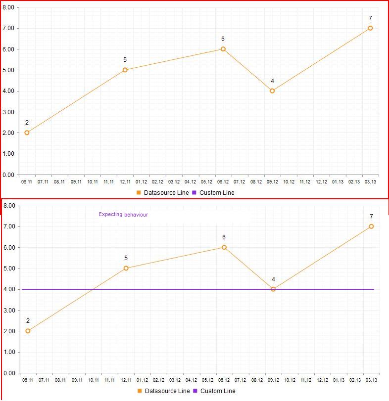 protected void Page_Load(object sender, EventArgs e){ #region Seria from DataTable LineSeries theLine = new LineSeries(); theLine.LabelsAppearance.Visible = true; theLine.LabelsAppearance.DataFormatString = "At {1} Temp is {0}";// some Labels theLine.DataFieldY = "Temparature"; // the databind field theLine.Name = "Datasource Temperature"; theLine.TooltipsAppearance.Visible = true; theLine.TooltipsAppearance.ClientTemplate = "At #=dataItem.TempDate.format(\"dd.MM.yy\")# <br />Temperature is: #=value.format(\"N2\")#"; #endregion //======================================================================================= #region HandMade LineSeria LineSeries theCustomLine = new LineSeries();//Note also that DataFieldX property is available only for a databound numeric series and not for LineSeries. That's why we'll use only Y property later. theCustomLine.LabelsAppearance.Visible = true; theCustomLine.LabelsAppearance.DataFormatString = "{1} {0}";// bla-bla theCustomLine.Name = "Custom Temperature"; theCustomLine.TooltipsAppearance.Visible = true; theCustomLine.Appearance.FillStyle.BackgroundColor = Color.BlueViolet; decimal theValue = decimal.Parse("3"); CategorySeriesItem item1 = null; for (int i = 0; i < 5; i++) { item1 = new CategorySeriesItem(); item1.Y = theValue; item1.BackgroundColor = Color.BlueViolet; theCustomLine.SeriesItems.Add(item1); } theCustomLine.Visible = true; #endregion //======================================================================================= SensorsRadChart.Legend.Appearance.Position = ChartLegendPosition.Bottom; SensorsRadChart.Legend.Appearance.Orientation = ChartLegendOrientation.Horizontal; SensorsRadChart.Legend.Appearance.Visible = true; //======================================================================================= SensorsRadChart.PlotArea.Series.Add(theLine); // Adding Seria for DataBinding from DataTable SensorsRadChart.PlotArea.Series.Add(theCustomLine); // Adding Custom LineSeria with handmade data. SensorsRadChart.DataSource = GetTableData(); SensorsRadChart.DataBind(); // Fill all Seria and show Chart with Data from DataTable&Handmade Line} protected DataTable GetTableData() { DataTable dt = new DataTable(); dt.Columns.Add("ID", typeof(int)); dt.Columns.Add("Temparature", typeof(int)); dt.Columns.Add("TempDate", typeof(DateTime)); dt.Rows.Add(1, 2, new DateTime(2011, 06, 12, 0 ,0 ,0)); dt.Rows.Add(2, 5, new DateTime(2011, 12, 12, 0, 0, 0)); dt.Rows.Add(3, 6, new DateTime(2012, 06, 17, 0, 0, 0)); dt.Rows.Add(4, 4, new DateTime(2012, 09, 18, 0, 0, 0)); dt.Rows.Add(5, 7, new DateTime(2013, 03, 18, 0, 0, 0)); return dt; }Please find my comments and suggestions below: