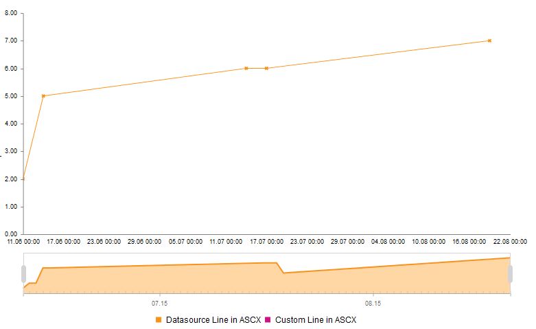theHtmlChart.Legend.Appearance.Position = ChartLegendPosition.Bottom; theHtmlChart.Legend.Appearance.Orientation = ChartLegendOrientation.Horizontal; theHtmlChart.Legend.Appearance.Visible = true; // ------------------------ Y ------------------------------------------------------------- theHtmlChart.PlotArea.YAxis.Visible = true; theHtmlChart.PlotArea.YAxis.MinValue = 0; theHtmlChart.PlotArea.YAxis.MaxValue = 8; theHtmlChart.PlotArea.YAxis.Name = "theValueAxis"; theHtmlChart.PlotArea.YAxis.TitleAppearance.Text = "Temperature"; theHtmlChart.PlotArea.YAxis.LabelsAppearance.Color = Color.Black; theHtmlChart.PlotArea.YAxis.LabelsAppearance.DataFormatString = "{0:N2}"; theHtmlChart.PlotArea.YAxis.LabelsAppearance.TextStyle.FontSize = new Unit(9, UnitType.Pixel); theHtmlChart.PlotArea.YAxis.Type = HtmlChartValueAxisType.Numeric; theHtmlChart.PlotArea.YAxis.NarrowRange = true; theHtmlChart.PlotArea.YAxis.MinorGridLines.Visible = false; // убрать направляющие для скорости theHtmlChart.PlotArea.YAxis.MajorGridLines.Visible = false; // ------------------------ X ------------------------------------------------------------- theHtmlChart.PlotArea.XAxis.DataLabelsField = "SellDate"; theHtmlChart.PlotArea.XAxis.MinorGridLines.Visible = false; theHtmlChart.PlotArea.XAxis.MajorGridLines.Visible = false;// ------------------------ Navigator -------------------------------------------------------------AreaSeries theLineNavigator = new AreaSeries(); theLineNavigator.Name = "theNavigatorDates"; theLineNavigator.DataFieldY = "SellQuantity"; theLineNavigator.MissingValues = MissingValuesBehavior.Interpolate; theHtmlChart.Navigator.RangeSelector.From = dDateFrom; theHtmlChart.Navigator.RangeSelector.To = dDateTo; theHtmlChart.Navigator.SelectionHint.DataFormatString = "From {0:dd.MM.yyyy} to {1:dd.MM.yyyy}"; theHtmlChart.Navigator.SelectionHint.Visible = true; theHtmlChart.Navigator.Series.Clear(); theHtmlChart.Navigator.Series.Add(theLineNavigator); // from DataBinded field theHtmlChart.Navigator.Series.Add(theCustomLine); // Custom/"Handmade" LineSeria - will not be shown except in the legendtheHtmlChart.DataSource = GetTableData(); theHtmlChart.DataBind();